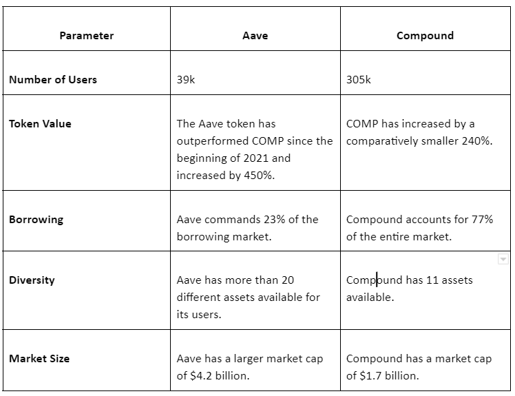 When comparing Aave and Compound, it can be argued that Aave has outperformed Compound in terms of innovation and execution. Aave offers a broader selection of cryptocurrency assets and offers unique products like flash loans.
